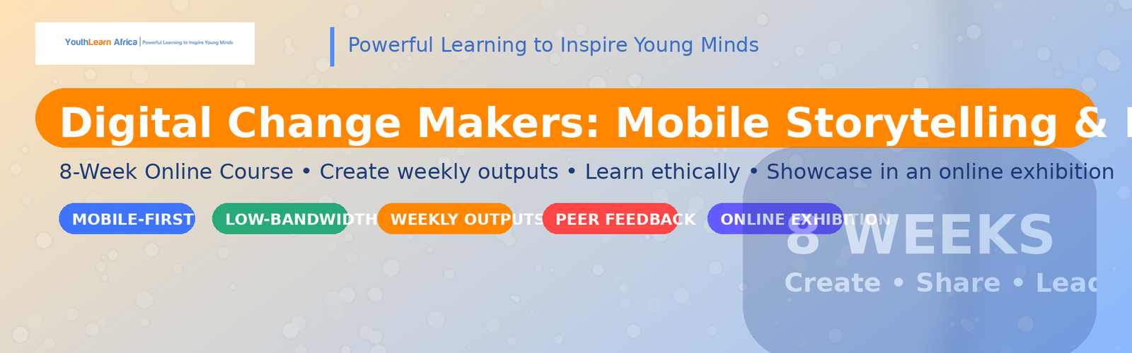 Digital Change Makers is a mobile-first online course by YouthLearn Africa that helps young people build media literacy and real digital production skills. Learners create one meaningful output every week—story seeds, storyboards, photo essays, audio stories, and videos ending with a final published story and an online exhibition showcase.